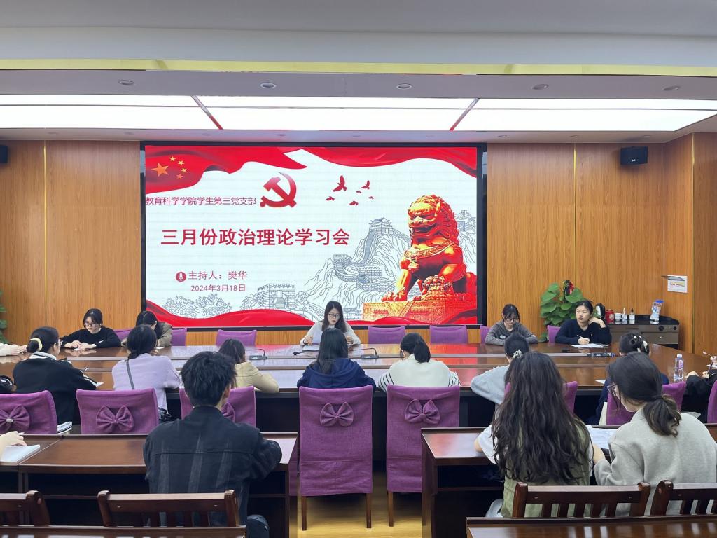 3月4日至19日,明升体育88六个学生党支部于明德楼教室陆续召开3月份政治理论学习会,会议由各党支部书记主持,支部全体党员参加。