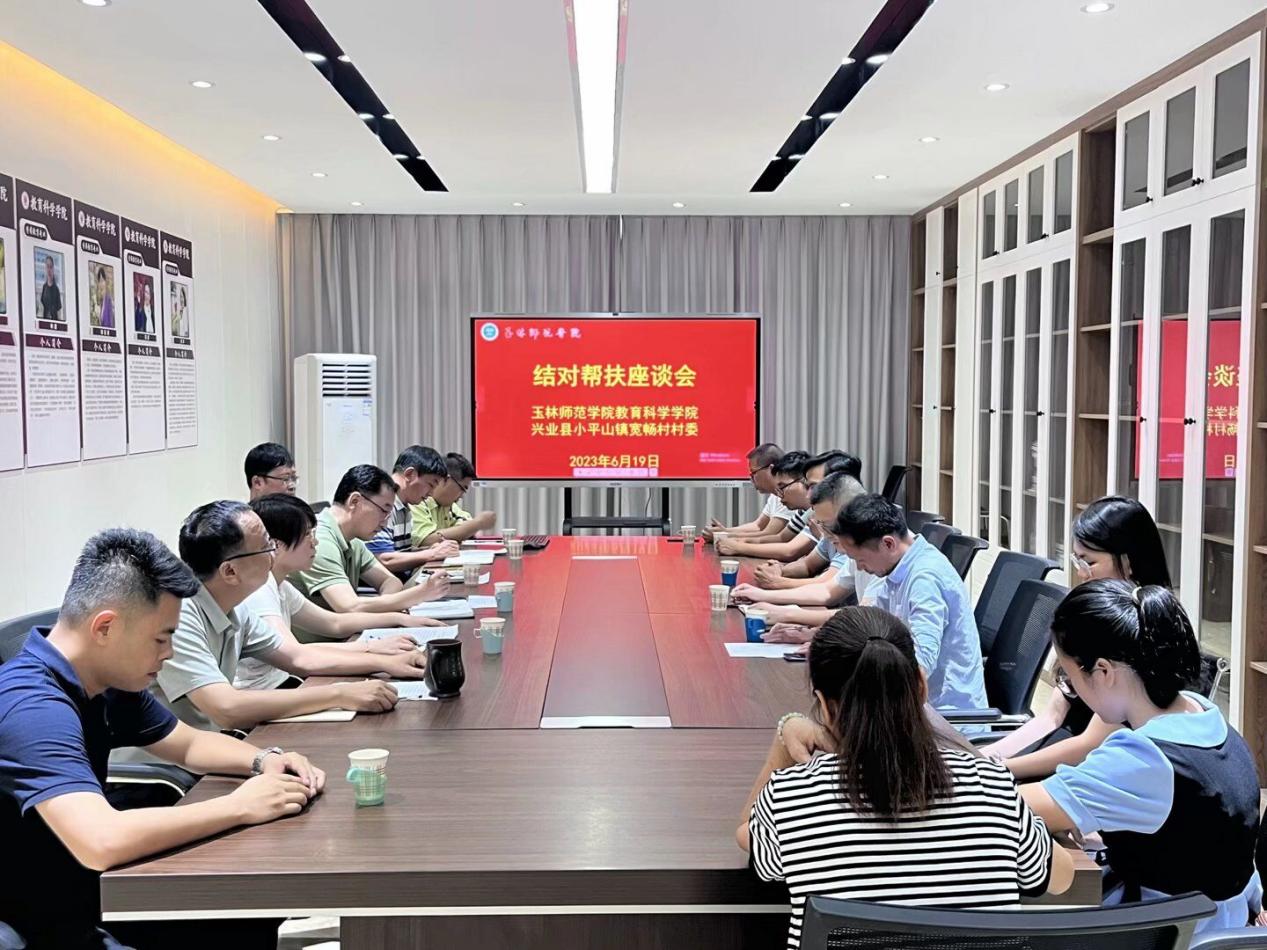崔海波对兴业县小平山镇党委副书记罗钊一行的到来表示热烈欢迎,双方就如何开展党建共建进行深入交流。崔海波表示,学院将采取“党建引领、协同创新、合力共建、共促发展”方式,利用学院在乡村教育、人才、文化传承等方面的优势,与宽畅村村委在共谋乡村振兴上一同发力。兴业县小平山镇党委副书记罗钊代表村委会对学院帮扶乡村、助力基层党建工作表示衷心感谢,并介绍了宽畅村基础设施建设、人居环境整治工作、产业发展等情况。 最后,双方就党建结对共建工作达成共识,双方表示将以教育帮扶为切入点,深化校地合作的深度和广度,把帮扶工作做好、做深、做实,促进双方在党的建设、基层治理与教育事业融合发展。