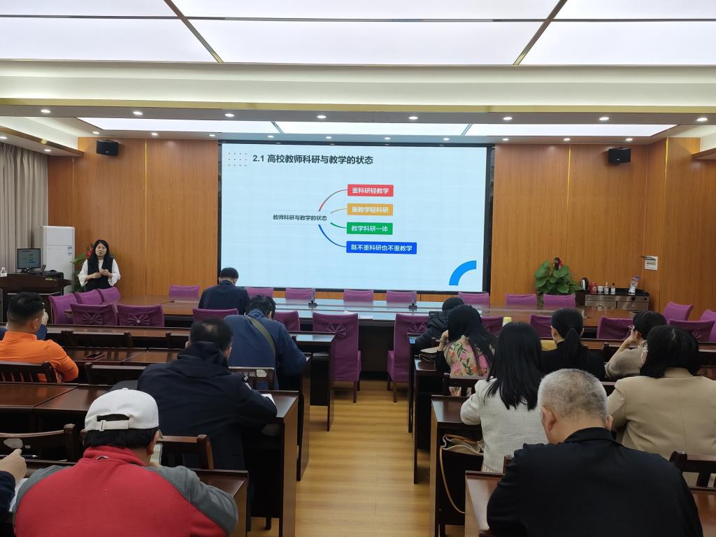 为进一步提升明升体育88教师教育教学研究水平与人才培养能力,3月21日下午第七、八节,明升体育88于明升体育88明德楼310会议室开展主题教研活动。本次教研活动由明升体育88副院长程传利主持,明升体育88副院长杨振芳做“高校教师教研一体化策略浅谈”主题分享,明升体育88全体教师参加。