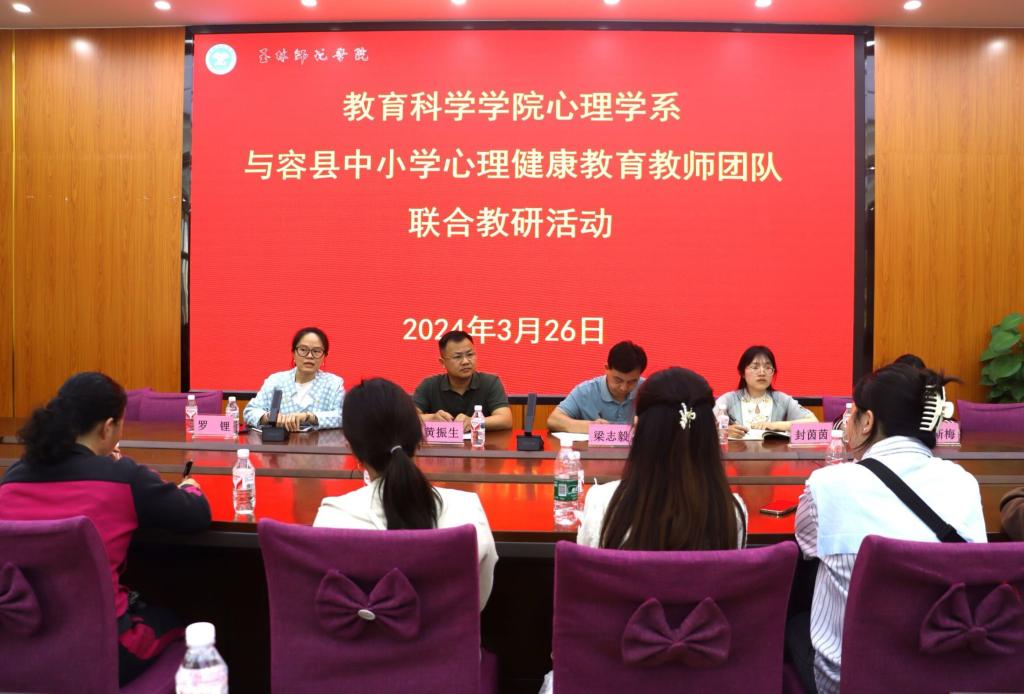 3月26日下午,明升体育88于东校区明德楼310会议室与容县中小学心理健康教育教学团队开展以心理学和中小学教育教学融合为主题的联合教研活动。本次教研活动由应用心理学系主任罗锂主持,容县容州镇都峤中学党支部书记黄振生、容县绿荫中学党总支部书记梁志毅、双方教师代表以及学生代表参加本次联合教研活动。