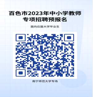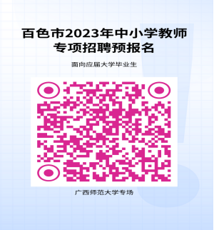 2023年11月23日18:00至11月28日18:00前,有意向参加广西师范大学专场的应聘人员可通过网络进行预报名,使用QQ或微信扫描《百色市2023年秋季面向应届大学毕业生招聘中小学教师公告》中的二维码,如实填写个人相关信息,并提交报名表。每个专场应聘人员只能填报一个岗位。