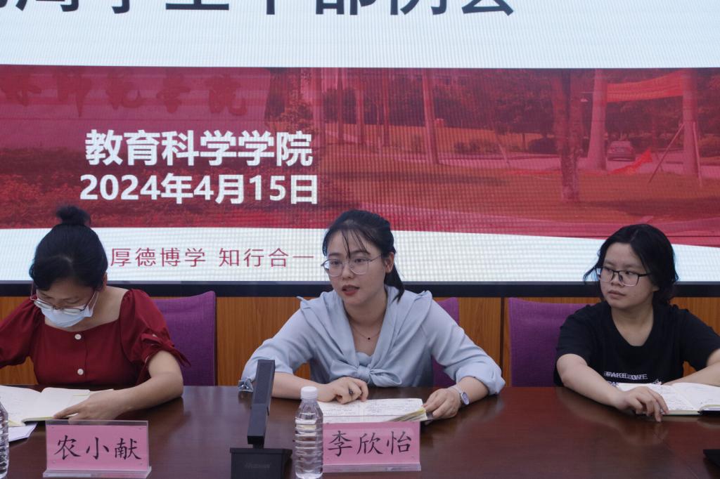 会上,各部门负责人及工作人员总结上周工作内容,简要阐述本周工作要点。李欣怡对各部门的工作汇报进行补充和总结。随后,农小献对第二十届卓越教师教育文化节开幕式活动流程及2024年全区师范生教学技能比赛院级选拔赛活动方案进行简要说明,并对开幕式与选拔赛的场地布置、后勤保障、服务流程等工作进行安排部署,她希望全体学生干部认真落实相关工作,确保工作圆满完成。最后,李欣怡表示,此类大型活动是体现明升体育88学生干部责任担当与展示自身能力平台,她希望全体学生干部将服务学院、服务同学的思想落实于具体行动中,积极投入工作任务。